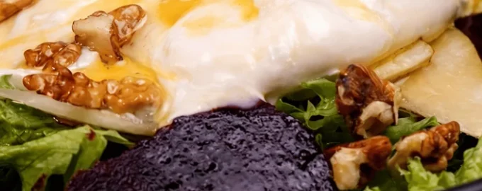 - Colocar las hojas de ensalada en el fondo de un plato, cubrir con rodajas de remolacha hervida o asada, finas láminas de pera y burata.