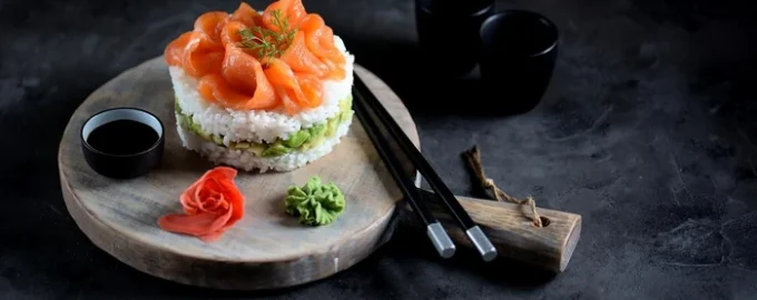Pastel de sushi con pescado rojo y aguacate
