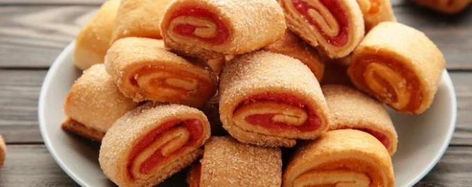 - En una superficie de trabajo espolvoreada con harina, extender cada parte en forma rectangular, recortar los bordes, untar con mermelada, enrollar formando rollos, cortar en partes iguales y colocar en una bandeja de horno forrada con papel pergamino.